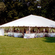 Pictured above is the interior of a frame tent. Frame tents have an aluminum frame that the canopy is placed over and strapped to before the legs are installed. Because of the frame, these tents do NOT have center poles, leaving the area underneath completely open. Frame tents are free-standing and only required to be anchored for safety reasons. Frame tents also can use 7’ or 8’ legs and offer a lot of options in smaller sizes, including expandable 9x10 marquees that can be used to create walkways.